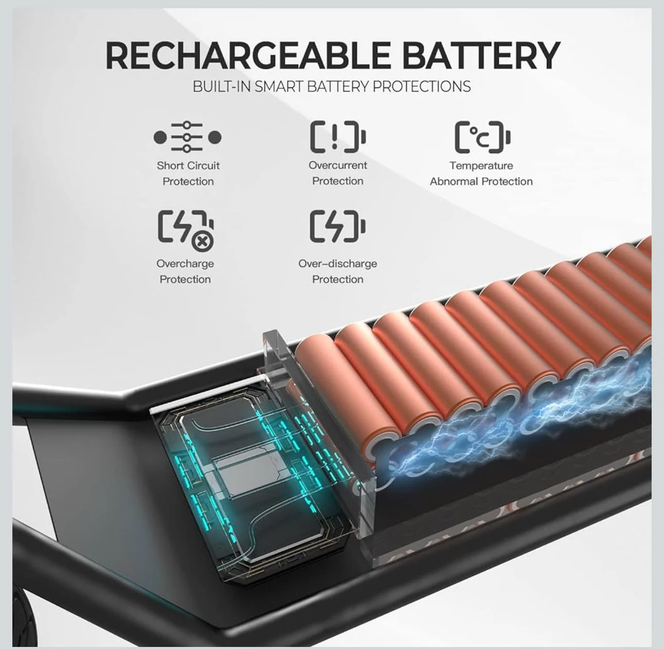 36V lithium battery with smart protections (short-circuit, overcharge, temp control).